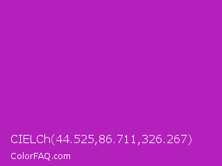 CIELCh 44.525,86.711,326.267 Color is a normal magenta color and the nearest color is Byzantine #bd33a4. Hex code #b320bb and RGB value is rgb(179,32,187). In RGB color space, this color is composed of 70% red, 13% green, 73% blue, In CMYK color space, this color is composed of 4% cyan, 83% magenta, 0% yellow , 27% black , In HSL color space, this color has a hue angle of 297° , 71% saturation and 43% lightness.