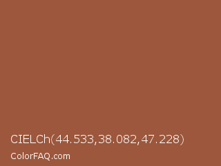 CIELCh 44.533,38.082,47.228 Color is a normal orange color and the nearest color is Sepia Skin #9e5b40. Hex code #9c573c and RGB value is rgb(156,87,60). In RGB color space, this color is composed of 61% red, 34% green, 24% blue, In CMYK color space, this color is composed of 0% cyan, 44% magenta, 62% yellow , 39% black , In HSL color space, this color has a hue angle of 17° , 44% saturation and 42% lightness.