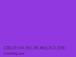 CIELCh 44.561,95.863,313.339 Color is a normal purple color and the nearest color is Blue Violet #8a2be2. Hex code #9138e0 and RGB value is rgb(145,56,224). In RGB color space, this color is composed of 57% red, 22% green, 88% blue, In CMYK color space, this color is composed of 35% cyan, 75% magenta, 0% yellow , 12% black , In HSL color space, this color has a hue angle of 272° , 73% saturation and 55% lightness.