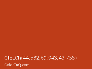 CIELCh 44.582,69.943,43.755 Color is a normal red color and the nearest color is Dark Pastel Red #c23b22. Hex code #be3c18 and RGB value is rgb(190,60,24). In RGB color space, this color is composed of 75% red, 24% green, 9% blue, In CMYK color space, this color is composed of 0% cyan, 68% magenta, 87% yellow , 25% black , In HSL color space, this color has a hue angle of 13° , 78% saturation and 42% lightness.