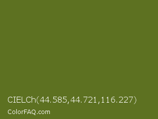 CIELCh 44.585,44.721,116.227 Color is a dark lime color and the nearest color is Fern Frond #657220. Hex code #5d7121 and RGB value is rgb(93,113,33). In RGB color space, this color is composed of 36% red, 44% green, 13% blue, In CMYK color space, this color is composed of 18% cyan, 0% magenta, 71% yellow , 56% black , In HSL color space, this color has a hue angle of 75° , 55% saturation and 29% lightness.
