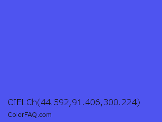 CIELCh 44.592,91.406,300.224 Color is a light blue color and the nearest color is Ultramarine Blue #4166f5. Hex code #4e54f0 and RGB value is rgb(78,84,240). In RGB color space, this color is composed of 31% red, 33% green, 94% blue, In CMYK color space, this color is composed of 68% cyan, 65% magenta, 0% yellow , 6% black , In HSL color space, this color has a hue angle of 238° , 84% saturation and 62% lightness.