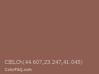 CIELCh 44.607,23.247,41.045 Color is a normal red color and the nearest color is Spicy Mix #8b5f4d. Hex code #8d5e51 and RGB value is rgb(141,94,81). In RGB color space, this color is composed of 55% red, 37% green, 32% blue, In CMYK color space, this color is composed of 0% cyan, 33% magenta, 43% yellow , 45% black , In HSL color space, this color has a hue angle of 13° , 27% saturation and 44% lightness.