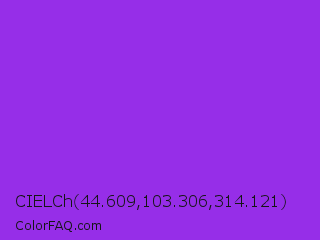 CIELCh 44.609,103.306,314.121 Color is a normal purple color and the nearest color is Blue Violet #8a2be2. Hex code #962ee8 and RGB value is rgb(150,46,232). In RGB color space, this color is composed of 59% red, 18% green, 91% blue, In CMYK color space, this color is composed of 35% cyan, 80% magenta, 0% yellow , 9% black , In HSL color space, this color has a hue angle of 274° , 80% saturation and 55% lightness.