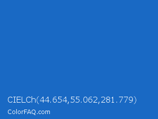 CIELCh 44.654,55.062,281.779 Color is a normal blue color and the nearest color is Denim #1560bd. Hex code #1969c4 and RGB value is rgb(25,105,196). In RGB color space, this color is composed of 10% red, 41% green, 77% blue, In CMYK color space, this color is composed of 87% cyan, 46% magenta, 0% yellow , 23% black , In HSL color space, this color has a hue angle of 212° , 77% saturation and 43% lightness.