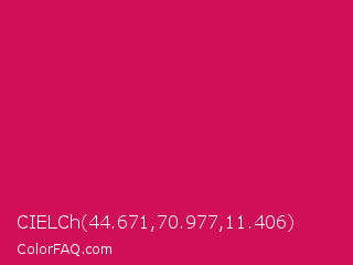 CIELCh 44.671,70.977,11.406 Color is a normal rose color and the nearest color is Debian Red #d70a53. Hex code #cf1056 and RGB value is rgb(207,16,86). In RGB color space, this color is composed of 81% red, 6% green, 34% blue, In CMYK color space, this color is composed of 0% cyan, 92% magenta, 58% yellow , 19% black , In HSL color space, this color has a hue angle of 338° , 86% saturation and 44% lightness.