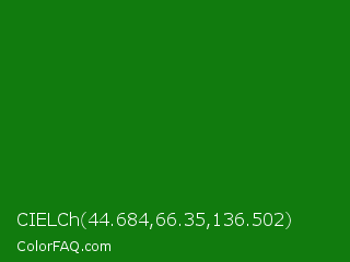 CIELCh 44.684,66.35,136.502 Color is a dark green color and the nearest color is India Green #138808. Hex code #117b0e and RGB value is rgb(17,123,14). In RGB color space, this color is composed of 7% red, 48% green, 5% blue, In CMYK color space, this color is composed of 86% cyan, 0% magenta, 89% yellow , 52% black , In HSL color space, this color has a hue angle of 118° , 80% saturation and 27% lightness.