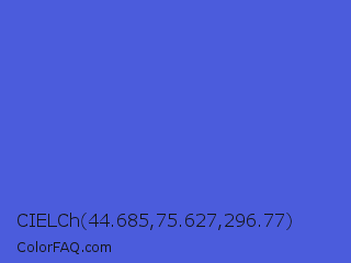CIELCh 44.685,75.627,296.77 Color is a normal blue color and the nearest color is Royal Blue #4169e1. Hex code #4b5cdc and RGB value is rgb(75,92,220). In RGB color space, this color is composed of 29% red, 36% green, 86% blue, In CMYK color space, this color is composed of 66% cyan, 58% magenta, 0% yellow , 14% black , In HSL color space, this color has a hue angle of 233° , 67% saturation and 58% lightness.