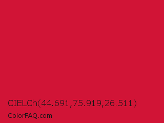 CIELCh 44.691,75.919,26.511 Color is a normal red color and the nearest color is Crimson #dc143c. Hex code #d11436 and RGB value is rgb(209,20,54). In RGB color space, this color is composed of 82% red, 8% green, 21% blue, In CMYK color space, this color is composed of 0% cyan, 90% magenta, 74% yellow , 18% black , In HSL color space, this color has a hue angle of 349° , 83% saturation and 45% lightness.