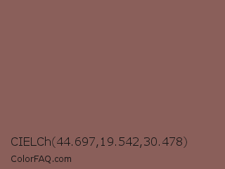 CIELCh 44.697,19.542,30.478 Color is a normal red color and the nearest color is Rose Taupe #905d5d. Hex code #8a5f5a and RGB value is rgb(138,95,90). In RGB color space, this color is composed of 54% red, 37% green, 35% blue, In CMYK color space, this color is composed of 0% cyan, 31% magenta, 35% yellow , 46% black , In HSL color space, this color has a hue angle of 6° , 21% saturation and 45% lightness.