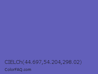 CIELCh 44.697,54.204,298.02 Color is a normal indigo color and the nearest color is Blue Violet #6456b7. Hex code #625fba and RGB value is rgb(98,95,186). In RGB color space, this color is composed of 38% red, 37% green, 73% blue, In CMYK color space, this color is composed of 47% cyan, 49% magenta, 0% yellow , 27% black , In HSL color space, this color has a hue angle of 242° , 40% saturation and 55% lightness.