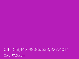 CIELCh 44.698,86.633,327.401 Color is a normal magenta color and the nearest color is Byzantine #bd33a4. Hex code #b61db9 and RGB value is rgb(182,29,185). In RGB color space, this color is composed of 71% red, 11% green, 73% blue, In CMYK color space, this color is composed of 2% cyan, 84% magenta, 0% yellow , 27% black , In HSL color space, this color has a hue angle of 299° , 73% saturation and 42% lightness.