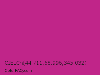 CIELCh 44.711,68.996,345.032 Color is a normal magenta color and the nearest color is Royal Fuchsia #ca2c92. Hex code #c02589 and RGB value is rgb(192,37,137). In RGB color space, this color is composed of 75% red, 15% green, 54% blue, In CMYK color space, this color is composed of 0% cyan, 81% magenta, 29% yellow , 25% black , In HSL color space, this color has a hue angle of 321° , 68% saturation and 45% lightness.