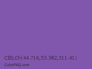 CIELCh 44.716,53.382,311.41 Color is a normal violet color and the nearest color is Royal Purple #7851a9. Hex code #8156ad and RGB value is rgb(129,86,173). In RGB color space, this color is composed of 51% red, 34% green, 68% blue, In CMYK color space, this color is composed of 25% cyan, 50% magenta, 0% yellow , 32% black , In HSL color space, this color has a hue angle of 270° , 35% saturation and 51% lightness.