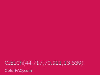 CIELCh 44.717,70.911,13.539 Color is a normal rose color and the nearest color is Debian Red #d70a53. Hex code #cf1352 and RGB value is rgb(207,19,82). In RGB color space, this color is composed of 81% red, 7% green, 32% blue, In CMYK color space, this color is composed of 0% cyan, 91% magenta, 60% yellow , 19% black , In HSL color space, this color has a hue angle of 340° , 83% saturation and 44% lightness.