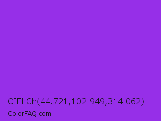 CIELCh 44.721,102.949,314.062 Color is a normal purple color and the nearest color is Blue Violet #8a2be2. Hex code #962fe8 and RGB value is rgb(150,47,232). In RGB color space, this color is composed of 59% red, 18% green, 91% blue, In CMYK color space, this color is composed of 35% cyan, 80% magenta, 0% yellow , 9% black , In HSL color space, this color has a hue angle of 273° , 80% saturation and 55% lightness.