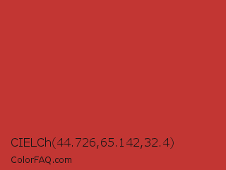 CIELCh 44.726,65.142,32.4 Color is a normal red color and the nearest color is International Orange Golden Gate Bridge #c0362c. Hex code #c23633 and RGB value is rgb(194,54,51). In RGB color space, this color is composed of 76% red, 21% green, 20% blue, In CMYK color space, this color is composed of 0% cyan, 72% magenta, 74% yellow , 24% black , In HSL color space, this color has a hue angle of 1° , 58% saturation and 48% lightness.