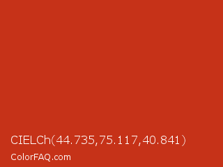 CIELCh 44.735,75.117,40.841 Color is a normal red color and the nearest color is Thunderbird #c02b18. Hex code #c63218 and RGB value is rgb(198,50,24). In RGB color space, this color is composed of 78% red, 20% green, 9% blue, In CMYK color space, this color is composed of 0% cyan, 75% magenta, 88% yellow , 22% black , In HSL color space, this color has a hue angle of 9° , 78% saturation and 44% lightness.