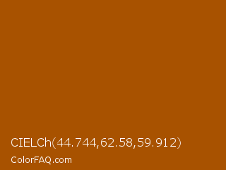 CIELCh 44.744,62.58,59.912 Color is a normal orange color and the nearest color is Windsor Tan #a75502. Hex code #a85200 and RGB value is rgb(168,82,0). In RGB color space, this color is composed of 66% red, 32% green, 0% blue, In CMYK color space, this color is composed of 0% cyan, 51% magenta, 100% yellow , 34% black , In HSL color space, this color has a hue angle of 29° , 100% saturation and 33% lightness.