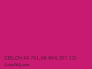CIELCh 44.761,68.864,357.13 Color is a normal rose color and the nearest color is Magenta Dye #ca1f7b. Hex code #c91a72 and RGB value is rgb(201,26,114). In RGB color space, this color is composed of 79% red, 10% green, 45% blue, In CMYK color space, this color is composed of 0% cyan, 87% magenta, 43% yellow , 21% black , In HSL color space, this color has a hue angle of 330° , 77% saturation and 45% lightness.
