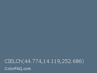 CIELCh 44.774,14.119,252.686 Color is a normal blue color and the nearest color is Paynes Grey #536878. Hex code #546d80 and RGB value is rgb(84,109,128). In RGB color space, this color is composed of 33% red, 43% green, 50% blue, In CMYK color space, this color is composed of 34% cyan, 15% magenta, 0% yellow , 50% black , In HSL color space, this color has a hue angle of 206° , 21% saturation and 42% lightness.