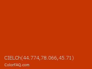 CIELCh 44.774,78.066,45.71 Color is a normal orange color and the nearest color is Mahogany #c04000. Hex code #c43603 and RGB value is rgb(196,54,3). In RGB color space, this color is composed of 77% red, 21% green, 1% blue, In CMYK color space, this color is composed of 0% cyan, 72% magenta, 98% yellow , 23% black , In HSL color space, this color has a hue angle of 16° , 97% saturation and 39% lightness.