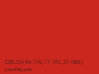 CIELCh 44.776,77.761,37.086 Color is a normal red color and the nearest color is Fire Engine Red #ce2029. Hex code #cc271e and RGB value is rgb(204,39,30). In RGB color space, this color is composed of 80% red, 15% green, 12% blue, In CMYK color space, this color is composed of 0% cyan, 81% magenta, 85% yellow , 20% black , In HSL color space, this color has a hue angle of 3° , 74% saturation and 46% lightness.