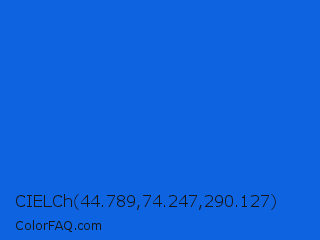 CIELCh 44.789,74.247,290.127 Color is a normal blue color and the nearest color is Science Blue #0066cc. Hex code #0d63e0 and RGB value is rgb(13,99,224). In RGB color space, this color is composed of 5% red, 39% green, 88% blue, In CMYK color space, this color is composed of 94% cyan, 56% magenta, 0% yellow , 12% black , In HSL color space, this color has a hue angle of 216° , 89% saturation and 46% lightness.