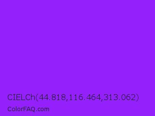 CIELCh 44.818,116.464,313.062 Color is a normal purple color and the nearest color is Veronica #a020f0. Hex code #9421fc and RGB value is rgb(148,33,252). In RGB color space, this color is composed of 58% red, 13% green, 99% blue, In CMYK color space, this color is composed of 41% cyan, 87% magenta, 0% yellow , 1% black , In HSL color space, this color has a hue angle of 272° , 97% saturation and 56% lightness.