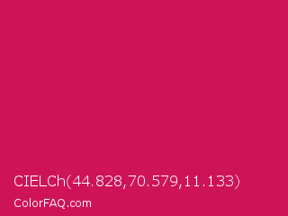 CIELCh 44.828,70.579,11.133 Color is a normal rose color and the nearest color is Debian Red #d70a53. Hex code #cf1357 and RGB value is rgb(207,19,87). In RGB color space, this color is composed of 81% red, 7% green, 34% blue, In CMYK color space, this color is composed of 0% cyan, 91% magenta, 58% yellow , 19% black , In HSL color space, this color has a hue angle of 338° , 83% saturation and 44% lightness.