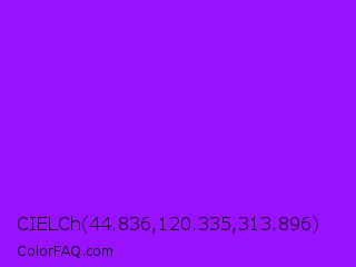 CIELCh 44.836,120.335,313.896 Color is a normal purple color and the nearest color is Vivid Violet #9f00ff. Hex code #9912ff and RGB value is rgb(153,18,255). In RGB color space, this color is composed of 60% red, 7% green, 100% blue, In CMYK color space, this color is composed of 40% cyan, 93% magenta, 0% yellow , 0% black , In HSL color space, this color has a hue angle of 274° , 100% saturation and 54% lightness.