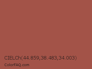 CIELCh 44.859,38.483,34.003 Color is a normal red color and the nearest color is Middle Red Purple #a55353. Hex code #a35348 and RGB value is rgb(163,83,72). In RGB color space, this color is composed of 64% red, 33% green, 28% blue, In CMYK color space, this color is composed of 0% cyan, 49% magenta, 56% yellow , 36% black , In HSL color space, this color has a hue angle of 7° , 39% saturation and 46% lightness.