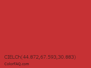 CIELCh 44.872,67.593,30.883 Color is a normal red color and the nearest color is Flush Mahogany #ca3435. Hex code #c63134 and RGB value is rgb(198,49,52). In RGB color space, this color is composed of 78% red, 19% green, 20% blue, In CMYK color space, this color is composed of 0% cyan, 75% magenta, 74% yellow , 22% black , In HSL color space, this color has a hue angle of 359° , 60% saturation and 48% lightness.