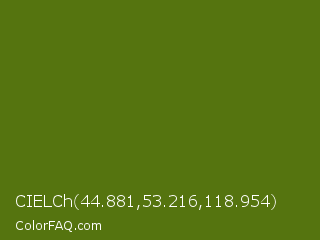 CIELCh 44.881,53.216,118.954 Color is a dark lime color and the nearest color is Avocado #568203. Hex code #55740f and RGB value is rgb(85,116,15). In RGB color space, this color is composed of 33% red, 45% green, 6% blue, In CMYK color space, this color is composed of 27% cyan, 0% magenta, 87% yellow , 55% black , In HSL color space, this color has a hue angle of 78° , 77% saturation and 26% lightness.