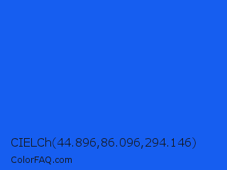 CIELCh 44.896,86.096,294.146 Color is a normal blue color and the nearest color is Blue Ribbon #0066ff. Hex code #165ef0 and RGB value is rgb(22,94,240). In RGB color space, this color is composed of 9% red, 37% green, 94% blue, In CMYK color space, this color is composed of 91% cyan, 61% magenta, 0% yellow , 6% black , In HSL color space, this color has a hue angle of 220° , 88% saturation and 51% lightness.