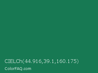 CIELCh 44.916,39.1,160.175 Color is a dark green color and the nearest color is Dark Spring Green #177245. Hex code #177953 and RGB value is rgb(23,121,83). In RGB color space, this color is composed of 9% red, 47% green, 33% blue, In CMYK color space, this color is composed of 81% cyan, 0% magenta, 31% yellow , 53% black , In HSL color space, this color has a hue angle of 157° , 68% saturation and 28% lightness.