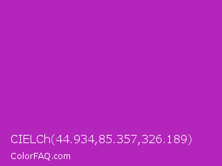 CIELCh 44.934,85.357,326.189 Color is a normal magenta color and the nearest color is Byzantine #bd33a4. Hex code #b325bb and RGB value is rgb(179,37,187). In RGB color space, this color is composed of 70% red, 15% green, 73% blue, In CMYK color space, this color is composed of 4% cyan, 80% magenta, 0% yellow , 27% black , In HSL color space, this color has a hue angle of 297° , 67% saturation and 44% lightness.
