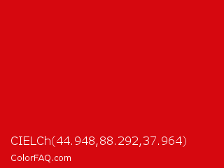 CIELCh 44.948,88.292,37.964 Color is a normal red color and the nearest color is Venetian Red #c80815. Hex code #d6080f and RGB value is rgb(214,8,15). In RGB color space, this color is composed of 84% red, 3% green, 6% blue, In CMYK color space, this color is composed of 0% cyan, 96% magenta, 93% yellow , 16% black , In HSL color space, this color has a hue angle of 358° , 93% saturation and 44% lightness.
