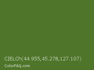 CIELCh 44.955,45.278,127.107 Color is a normal green color and the nearest color is Sap Green #507d2a. Hex code #4e752a and RGB value is rgb(78,117,42). In RGB color space, this color is composed of 31% red, 46% green, 16% blue, In CMYK color space, this color is composed of 33% cyan, 0% magenta, 64% yellow , 54% black , In HSL color space, this color has a hue angle of 91° , 47% saturation and 31% lightness.