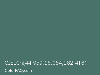 CIELCh 44.959,16.054,182.418 Color is a normal cyan color and the nearest color is Hookers Green #49796b. Hex code #49726b and RGB value is rgb(73,114,107). In RGB color space, this color is composed of 29% red, 45% green, 42% blue, In CMYK color space, this color is composed of 36% cyan, 0% magenta, 6% yellow , 55% black , In HSL color space, this color has a hue angle of 170° , 22% saturation and 37% lightness.