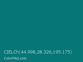 CIELCh 44.998,28.326,195.175 Color is a dark cyan color and the nearest color is Skobeloff #007474. Hex code #067776 and RGB value is rgb(6,119,118). In RGB color space, this color is composed of 2% red, 47% green, 46% blue, In CMYK color space, this color is composed of 95% cyan, 0% magenta, 1% yellow , 53% black , In HSL color space, this color has a hue angle of 179° , 90% saturation and 25% lightness.