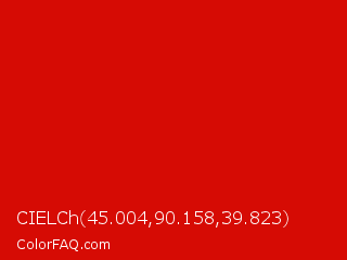 CIELCh 45.004,90.158,39.823 Color is a normal red color and the nearest color is Rosso Corsa #d40000. Hex code #d60b04 and RGB value is rgb(214,11,4). In RGB color space, this color is composed of 84% red, 4% green, 2% blue, In CMYK color space, this color is composed of 0% cyan, 95% magenta, 98% yellow , 16% black , In HSL color space, this color has a hue angle of 2° , 96% saturation and 43% lightness.