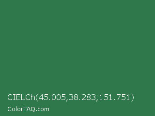 CIELCh 45.005,38.283,151.751 Color is a normal green color and the nearest color is Goblin #3d7d52. Hex code #2f784b and RGB value is rgb(47,120,75). In RGB color space, this color is composed of 18% red, 47% green, 29% blue, In CMYK color space, this color is composed of 61% cyan, 0% magenta, 38% yellow , 53% black , In HSL color space, this color has a hue angle of 143° , 44% saturation and 33% lightness.