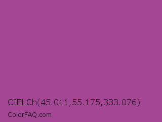 CIELCh 45.011,55.175,333.076 Color is a normal magenta color and the nearest color is Fandango #b53389. Hex code #a54695 and RGB value is rgb(165,70,149). In RGB color space, this color is composed of 65% red, 27% green, 58% blue, In CMYK color space, this color is composed of 0% cyan, 58% magenta, 10% yellow , 35% black , In HSL color space, this color has a hue angle of 310° , 40% saturation and 46% lightness.