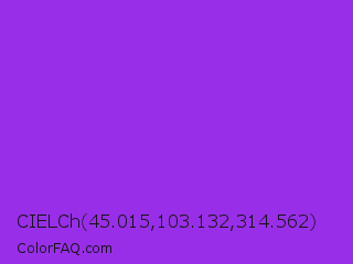 CIELCh 45.015,103.132,314.562 Color is a normal purple color and the nearest color is Blue Violet #8a2be2. Hex code #992ee8 and RGB value is rgb(153,46,232). In RGB color space, this color is composed of 60% red, 18% green, 91% blue, In CMYK color space, this color is composed of 34% cyan, 80% magenta, 0% yellow , 9% black , In HSL color space, this color has a hue angle of 275° , 80% saturation and 55% lightness.