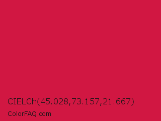 CIELCh 45.028,73.157,21.667 Color is a normal red color and the nearest color is Crimson #dc143c. Hex code #d11742 and RGB value is rgb(209,23,66). In RGB color space, this color is composed of 82% red, 9% green, 26% blue, In CMYK color space, this color is composed of 0% cyan, 89% magenta, 68% yellow , 18% black , In HSL color space, this color has a hue angle of 346° , 80% saturation and 45% lightness.