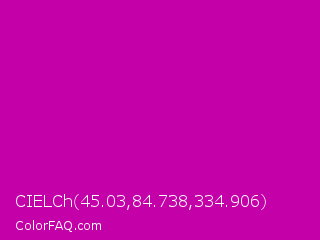CIELCh 45.03,84.738,334.906 Color is a normal magenta color and the nearest color is Heliotrope Magenta #aa00bb. Hex code #c400a8 and RGB value is rgb(196,0,168). In RGB color space, this color is composed of 77% red, 0% green, 66% blue, In CMYK color space, this color is composed of 0% cyan, 100% magenta, 14% yellow , 23% black , In HSL color space, this color has a hue angle of 309° , 100% saturation and 38% lightness.