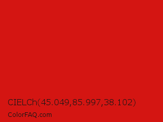CIELCh 45.049,85.997,38.102 Color is a normal red color and the nearest color is Lava #cf1020. Hex code #d41512 and RGB value is rgb(212,21,18). In RGB color space, this color is composed of 83% red, 8% green, 7% blue, In CMYK color space, this color is composed of 0% cyan, 90% magenta, 92% yellow , 17% black , In HSL color space, this color has a hue angle of 1° , 84% saturation and 45% lightness.
