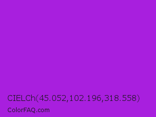 CIELCh 45.052,102.196,318.558 Color is a normal purple color and the nearest color is Veronica #a020f0. Hex code #a81fde and RGB value is rgb(168,31,222). In RGB color space, this color is composed of 66% red, 12% green, 87% blue, In CMYK color space, this color is composed of 24% cyan, 86% magenta, 0% yellow , 13% black , In HSL color space, this color has a hue angle of 283° , 75% saturation and 50% lightness.