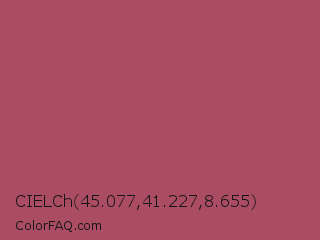 CIELCh 45.077,41.227,8.655 Color is a normal red color and the nearest color is Hippie Pink #ae4560. Hex code #aa4c62 and RGB value is rgb(170,76,98). In RGB color space, this color is composed of 67% red, 30% green, 38% blue, In CMYK color space, this color is composed of 0% cyan, 55% magenta, 42% yellow , 33% black , In HSL color space, this color has a hue angle of 346° , 38% saturation and 48% lightness.